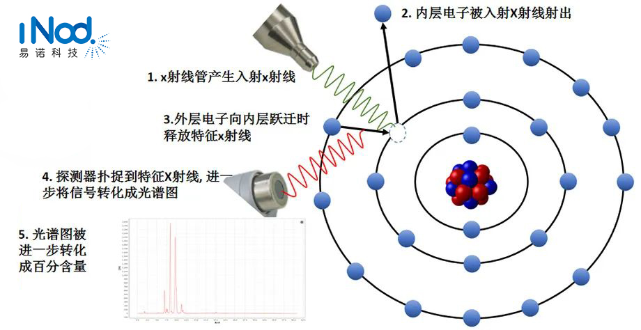 奧林巴斯手持式光譜儀的試樣中被測(cè)元素的原子受到來(lái)自于X射線管的一次X射線激發(fā)而引起內(nèi)層電子的躍遷,同時(shí)發(fā)射出具有一定能量的X 射線二次熒光,利用高性能(能量分辨率<170eV)的X 射線硅漂移SDD檢測(cè)器探測(cè)試樣中被測(cè)元素所發(fā)出的各種能量的特征X 射線,根據(jù)檢測(cè)器輸出信號(hào)的能量大小和強(qiáng)度來(lái)對(duì)被測(cè)元素進(jìn)行定性和定量分析。