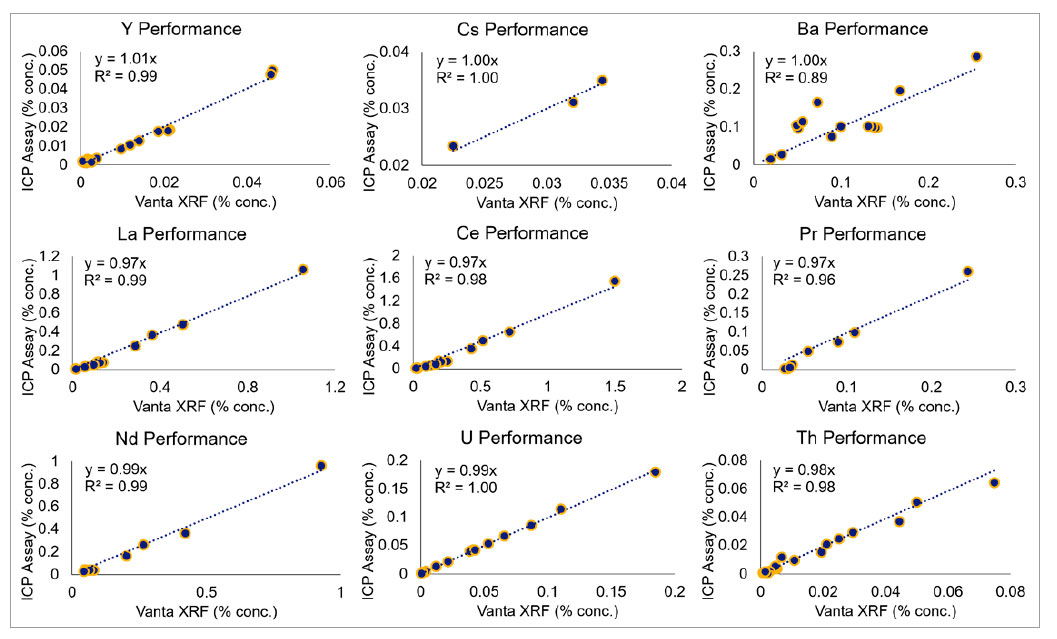 使用Vanta手持式XRF光譜儀,可以對(duì)稀土進(jìn)行檢測(cè)。手持XRF光譜儀在檢測(cè)各種礦產(chǎn)品樣品(包括氟碳酸鹽和次生磷酸鹽)時(shí),表現(xiàn)出非常高的性能。氟碳酸鹽通常是氟碳鈰礦,可提供釔、鈰和鑭;而磷酸鹽通常是獨(dú)居石,不僅含有鑭、鈰、鐠和釹,還含有較重的稀土元素釤和釓,以及放射性較弱的釷。正如每個(gè)圖表所示,元素的斜率和R2都接近于1,說(shuō)明Vanta在檢測(cè)氟碳鈰礦石和獨(dú)居石時(shí)均表現(xiàn)出很高的準(zhǔn)確性。