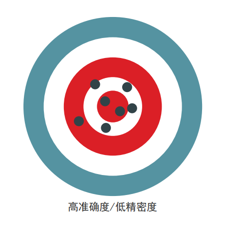 精密度是可重復(fù)性的一種度量,或者說一個檢測結(jié)果與另一個檢測結(jié)果的相近程度。準(zhǔn)確度表明所獲得的結(jié)果是否準(zhǔn)確地反映了實(shí)際情況(接近真值)。當(dāng)然,我們希望任何分析技術(shù)都能提供優(yōu)質(zhì)的精密度和準(zhǔn)確度。