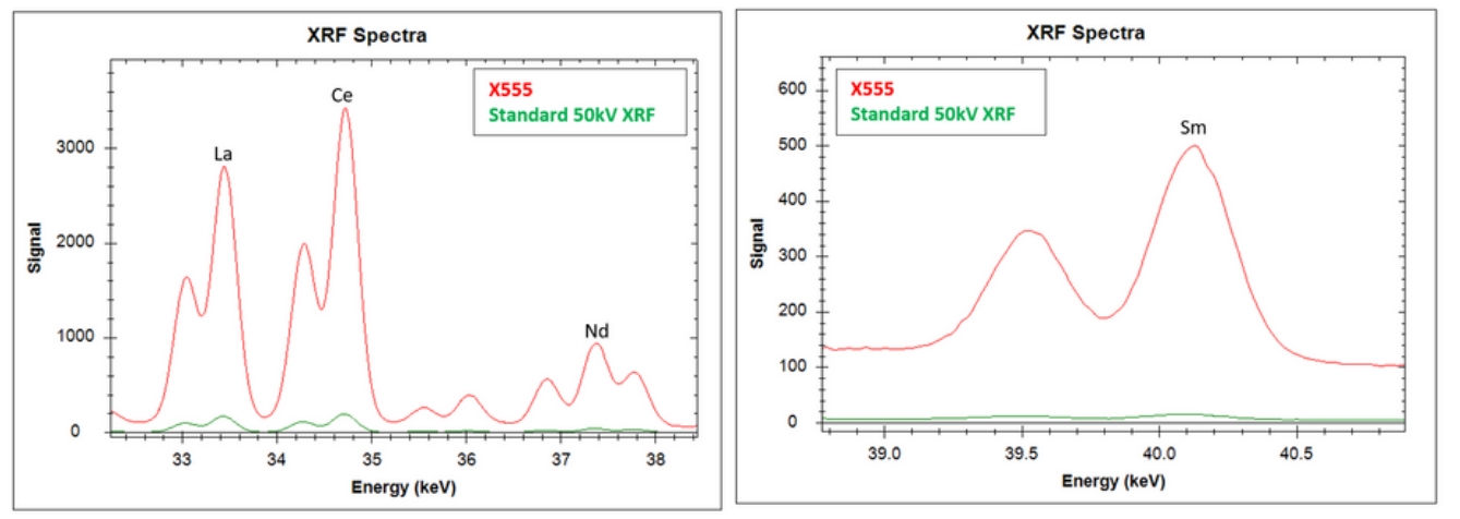 X-555利用55kV X射線管能更好地激發(fā)稀土元素能量。超大的70mm2 SDD硅源移探測器,更有效地檢測到更高的能量釋放,這實(shí)現(xiàn)了10倍更高的計(jì)數(shù)率(如:鑭)和30倍更高的計(jì)數(shù)率(如:釤Sm)。