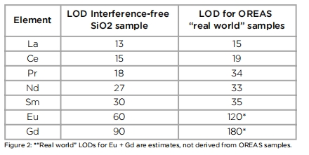 手持設(shè)備中的典型的X射線管只能工作到50 kV,稀土元素的有效激發(fā)能量差。而SciAps X-555采用55 kV的X射線管,大約能產(chǎn)生10倍以上的X射線有效激發(fā)能量。無干擾(二氧化硅)和高度具有挑戰(zhàn)性的OREAS REE礦石的值(這可以在圖2中找到)。LOD用于背景以上的3西格瑪檢測,120秒的測試時(shí)間。Sciaps光譜儀可作為化探手段。有規(guī)劃的進(jìn)行土壤、巖石露頭測試,剖面測試,光譜數(shù)據(jù)可作為地質(zhì)資料。常用礦石模式和土壤模式。無需進(jìn)行樣品制備或簡單樣品制備。
