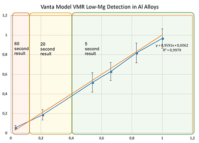 Vanta分析儀可以出色地完成鋁合金的分揀操作:快速、準(zhǔn)確地提供鎂元素的含量。Vanta分析儀通常使用不超過10秒鐘的檢測(cè)時(shí)間,就足以獲得各種不同鋁合金中鎂元素的含量值。而使用奧林巴斯早期的手持式XRF分析儀,往往需要使用20多秒的檢測(cè)時(shí)間,才可以完成相同的檢測(cè)。