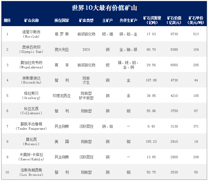 利用關聯公司礦業(yè)情報(MiningIntelligence)的數據,按照現行價格,Mining.com網站計算了礦山資源總價值,并列出了世界10大在產賤金屬和貴金屬礦山。