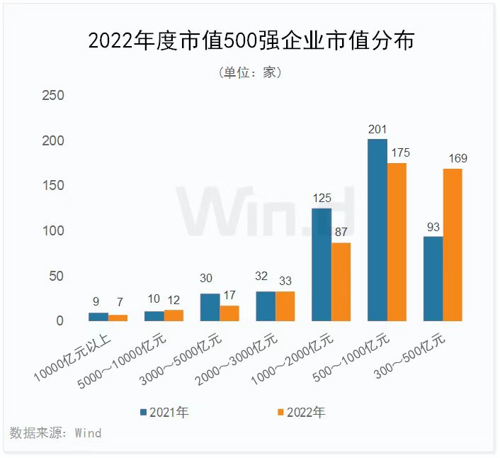 2022年度,500強中共有7家公司市值超1萬億元,數(shù)量較去年減少2家,3000-5000億元之間的企業(yè)、1000-2000億元之間的企業(yè)、500-1000億元之間的企業(yè)均有顯著減少,300-500億元之間的企業(yè)明顯增多。2022年度,500強企業(yè)平均市值為1325億元,中位數(shù)市值664億元,最低門檻為343億元,均出現(xiàn)回落。完整榜單中,共有76家新面孔躋身500強。