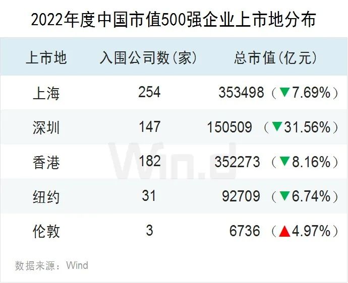 2022年度,因股市整體回調,上市公司股價集體走弱,入圍公司總市值亦出現(xiàn)明顯下降,其中,上海入圍公司總市值3.53萬億元,下降7.69%;深圳入圍公司總市值1.51萬億元,下降31.56%;香港入圍公司總市值3.52萬億元,下降8.16%;紐約入圍公司總市值9.27萬億元,下降6.74%。