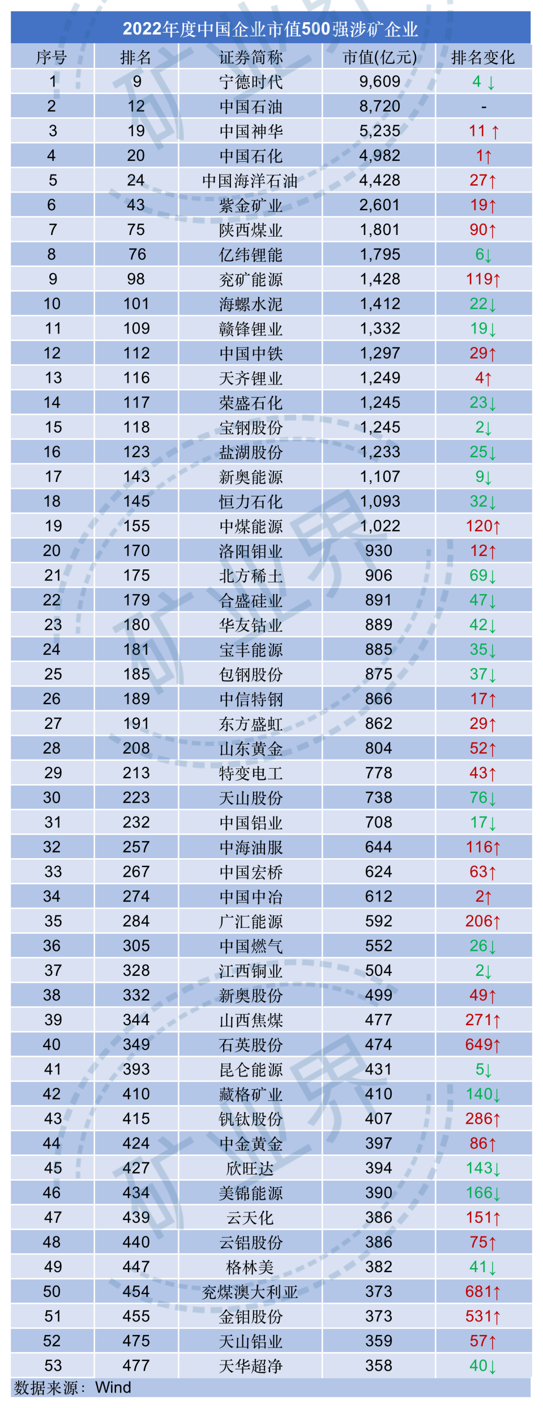 近日,Wind發(fā)布了2022年度“中國上市企業(yè)市值500強”榜單,礦業(yè)界梳理發(fā)現(xiàn),共有53家涉礦企業(yè)入圍排行榜,其中寧德時代、中國石油、中國神華市值排名涉礦企業(yè)前三。