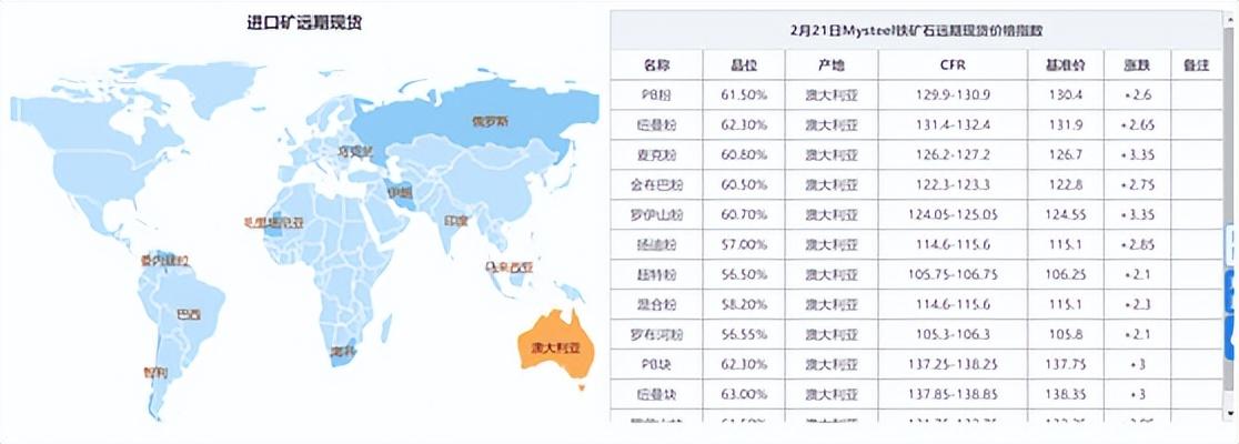 截至2月21日下午收盤,大商所鐵礦石期貨主力合約報(bào)收919元/噸,上漲3.43%,創(chuàng)下近九個(gè)月來價(jià)格新高,較去年10月底上漲超50%。西南期貨數(shù)據(jù)顯示,目前進(jìn)口礦報(bào)價(jià)已逼近130美元/噸,較今年初上漲約10%。