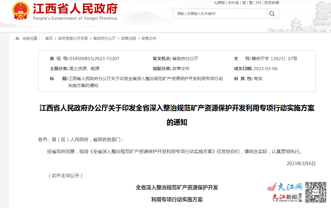 日前,江西省人民政府在其官方網(wǎng)站上發(fā)布了《全省深入整治規(guī)范礦產(chǎn)資源保護(hù)開發(fā)利用專項(xiàng)行動(dòng)實(shí)施方案》(下稱《方案》),從礦業(yè)權(quán)設(shè)置審批、礦山開采監(jiān)管、規(guī)范礦山企業(yè)經(jīng)營、礦山生態(tài)修復(fù)、建設(shè)綠色礦山、礦山安全生產(chǎn)和產(chǎn)業(yè)鏈供應(yīng)鏈安全等方面提出了六大措施,深入整治規(guī)范礦產(chǎn)資源保護(hù)開發(fā)利用。