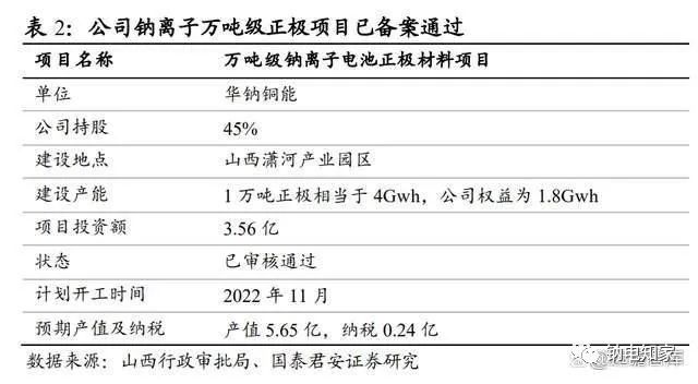 據(jù)山西轉(zhuǎn)型綜改示范區(qū)行政審批局2022年度 7 月企業(yè)投資項目備案結(jié)果公示表,公司萬噸級鈉離子電池正極材料項目已審核通過,且 11 月開工。