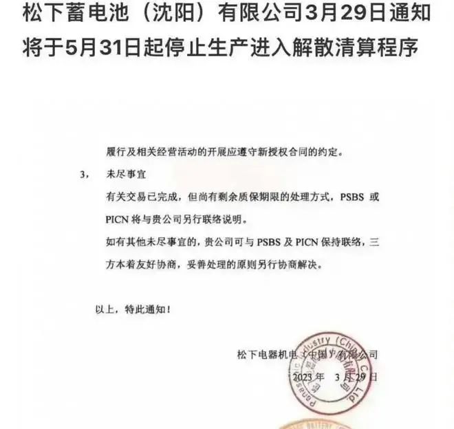近日,位列世界500強(qiáng)企業(yè)松下株式會社旗下公司松下蓄電池(沈陽)工廠發(fā)布了一份公告,宣布將會在2023年5月31日前全面停止生產(chǎn),進(jìn)入解散清算程序并不再開展任何經(jīng)營活動。意味著這個從1994年來沈陽投資建廠的企業(yè)結(jié)束了29年的生產(chǎn),正式退出了中國市場。