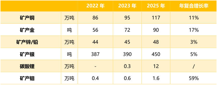 紫金礦業(yè)主要在全球范圍內(nèi)從事銅、金、鋅、鋰等金屬礦產(chǎn)資源勘查、開發(fā)及工程設(shè)計、技術(shù)應(yīng)用等業(yè)務(wù)。以大型超大型礦產(chǎn)的逆周期并購和自主地質(zhì)勘探增儲為重點,這也為紫金礦業(yè)持續(xù)發(fā)展提供了堅實的資源基礎(chǔ)。截至 2022 年 底,公司保有探明和控制及推斷的資源量: 銅 7371.86 萬噸、金 3117.39 噸、鋅(鉛)1118.33 萬噸、銀 14611.80 噸,鋰資源量(當(dāng)量碳酸鋰) 1215.21 萬噸。銅權(quán)益儲量占中國儲量 92%,金權(quán)益儲量占中國儲量 40%,是中國控制有色金屬礦產(chǎn)資源最多的大型礦業(yè)公司。