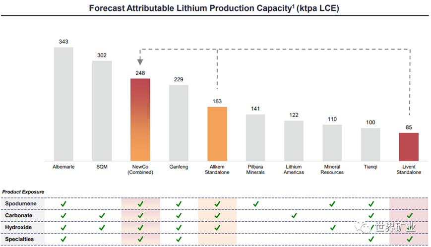 據(jù)測算,Allkem和Livent合并后,新公司預(yù)計產(chǎn)能達24.8萬噸碳酸鋰當(dāng)量(LCE),超過贛鋒鋰業(yè)(22.9萬噸)和天齊鋰業(yè)(10萬噸),位居世界第三,僅次于雅寶(Albemarle)和智利礦業(yè)化工(SQM)。