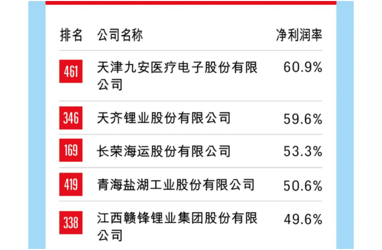 值得注意的是,在凈利潤率方面,排位最高的五家公司中,有三家是鋰電池相關行業(yè),其中天齊鋰業(yè)的凈利潤率高達59%,位列利潤率榜第二位,青海鹽湖和贛鋒鋰業(yè)分別以50.6%和49.6%的凈利潤率位列全部榜單的第四和第五位。