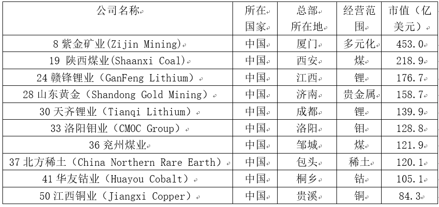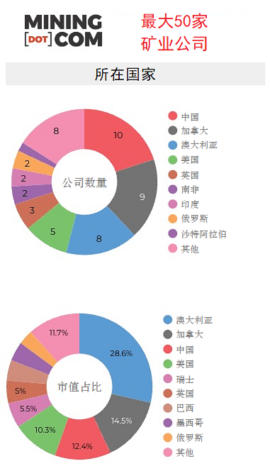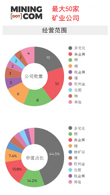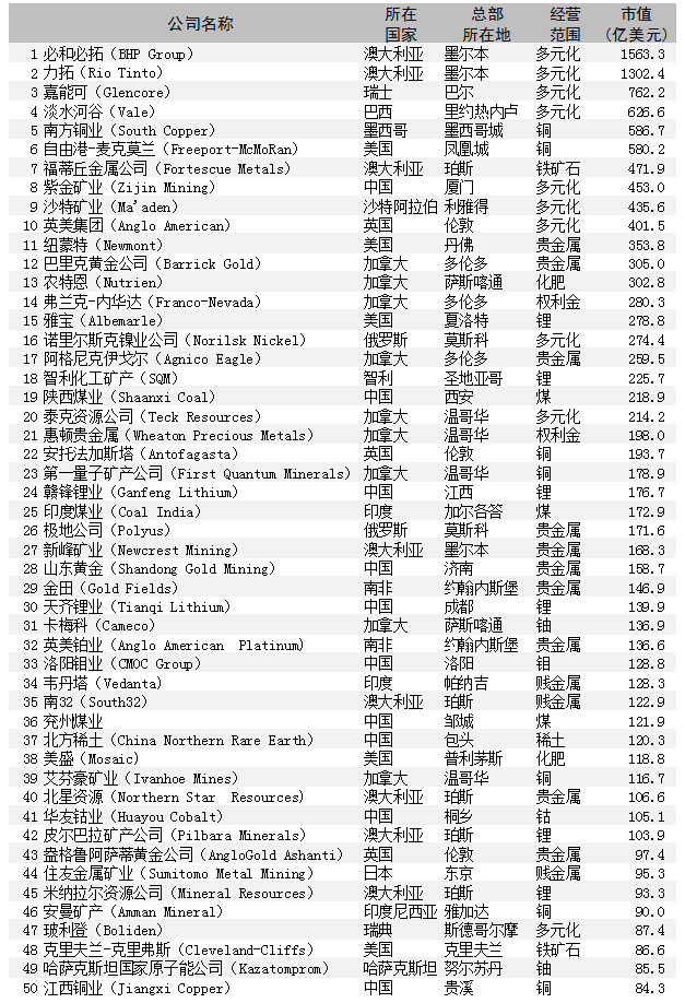 目前,50大礦企市值合計(jì)為1.38萬億美元,回落到2021年6月底的水平。