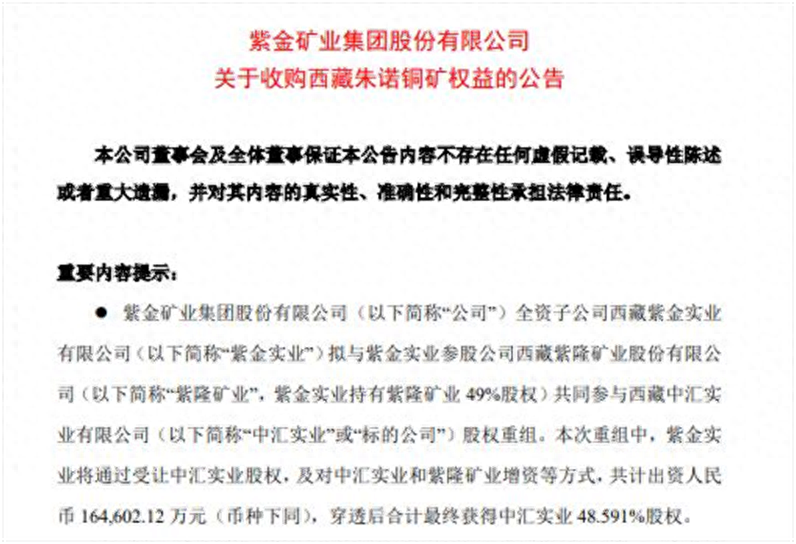 8月21日,紫金礦業(yè)宣布,以16.46億元收購中匯實業(yè)48.591%股權,進而獲得國內(nèi)未開發(fā)超大型銅礦西藏朱諾銅礦的相對控股權。根據(jù)協(xié)議,未來,朱諾銅礦的建設及運營將由紫金礦業(yè)主導。