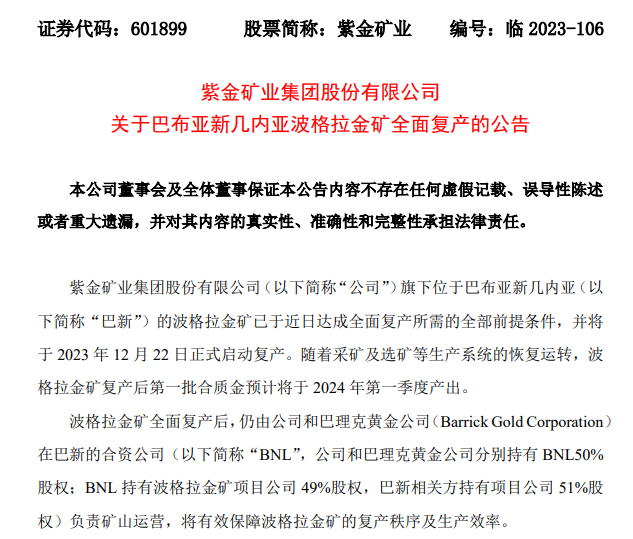 紫金礦業(yè)旗下巴布亞新幾內(nèi)亞波格拉金礦峰回路轉(zhuǎn),迎來復(fù)產(chǎn)倒計(jì)時(shí)。12月11日,紫金礦業(yè)發(fā)布公告,宣布波格拉金礦已于近日達(dá)成全面復(fù)產(chǎn)所需的全部前提條件,并將于2023年12月22日正式啟動復(fù)產(chǎn),預(yù)計(jì)將于2024年第一季度產(chǎn)出第一批合質(zhì)金。