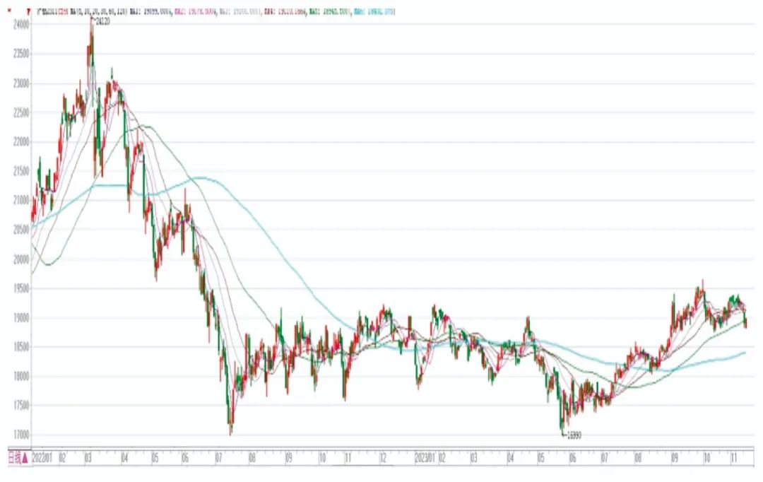 一是鋁價呈現(xiàn)高位回調(diào)態(tài)勢。9月下旬鋁價大幅上漲, 但10月份鋁價未能延續(xù)上漲態(tài)勢,呈高位回調(diào)的走勢,10月初,由于下游消費(fèi)轉(zhuǎn)弱,鋁呈累庫狀態(tài),因此節(jié)后鋁價走勢連續(xù)低迷,10月中旬,云南地區(qū)由于枯水季,部分電解鋁企業(yè)減產(chǎn),加之宏觀政策面有偏利好消息的支撐,使得鋁價有一定反彈。但是由于下游消費(fèi)連續(xù)低迷,后續(xù)鋁價上行壓力仍較大。10月份滬鋁主力合約價格處于18741元/噸~19252元/噸之間,均價為18996元/噸,環(huán)比上升304元/噸,漲幅1.6%,同比上升767元/噸,漲幅4.2%。滬鋁主力合約價格走勢情況見圖4。