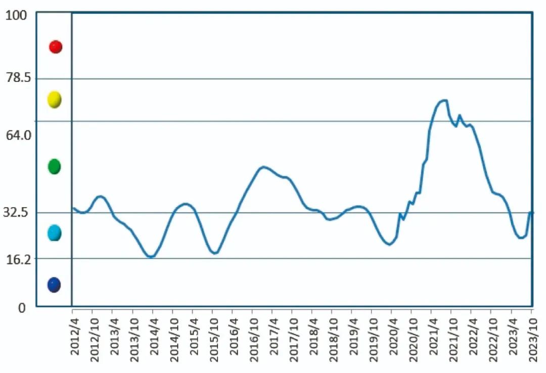 2023年10月份,中國鋁冶煉產(chǎn)業(yè)景氣指數(shù)為32.6,較上月上升1.3個點(diǎn),處于“正?!眳^(qū)間下部。中國鋁冶煉產(chǎn)業(yè)月度景氣指數(shù)走勢見圖1。