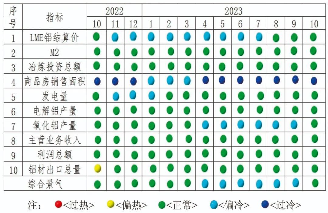 由中國鋁冶煉產(chǎn)業(yè)景氣信號燈(見圖2)可見,2023年10月份,在構(gòu)成產(chǎn)業(yè)景氣指數(shù)的10個指標(biāo)中,LME鋁結(jié)算價、M2、發(fā)電量、電解鋁產(chǎn)量、鋁冶煉投資總額、氧化鋁產(chǎn)量、主營業(yè)務(wù)收入、鋁材出口總量和利潤總額等9項(xiàng)指標(biāo)均處于“正?!眳^(qū)間;商品房銷售面積處于“過冷”區(qū)間。