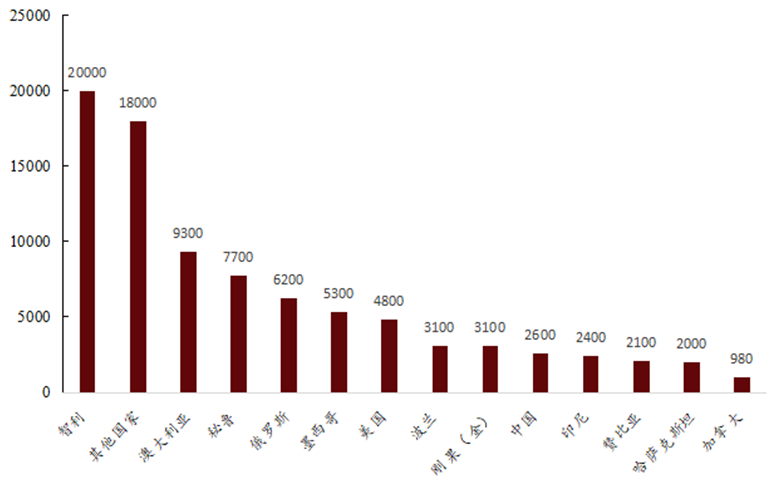全球銅資源儲量分布較集中,據(jù)USGS數(shù)據(jù),2022年全球銅儲量8.9億噸,其中智利、澳大利亞、秘魯儲量規(guī)模居前,分別占比21%、11%、9%,CR3達到 41%。從供應來看,智利、秘魯、剛果(金)為全球銅礦最重要的供給來源,2022年銅礦產(chǎn)量分別達520、220、220萬噸,占全球銅礦供給分別 24%、10%、10%。值得注意的是,智利正面臨礦山老化、品位下降的問題,年產(chǎn)量于2018年見頂于583 萬噸,隨后逐年下滑;秘魯2019年產(chǎn)銅246萬噸,隨后受疫情和當?shù)卣值纫蛩財_動有所減量,也在逐年下滑,2022年產(chǎn)量220萬噸;而非洲代表國家剛果(金)銅供給增量顯著,逐漸成長為最重要的供給國之一,年產(chǎn)量從2012年的60萬噸增長到2022年的220 萬噸,與老牌產(chǎn)銅國秘魯相當。