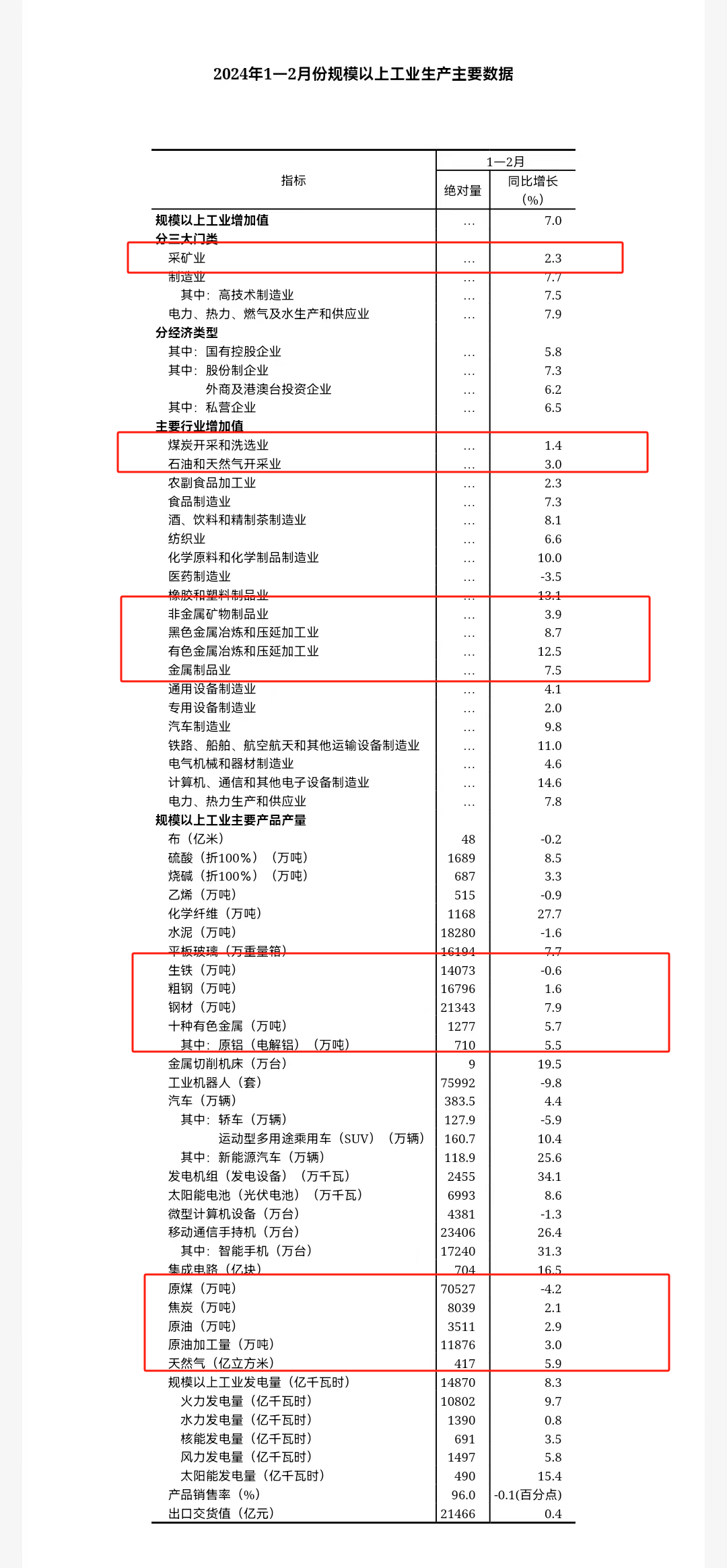 分行業(yè)看,1—2月份,41個大類行業(yè)中有39個行業(yè)增加值保持同比增長。其中,涉礦主要行業(yè)利潤情況如下:煤炭開采和洗選業(yè)增長1.4%,石油和天然氣開采業(yè)增長3.0%,金屬礦物制品業(yè)增長3.9%,黑色金屬冶煉和壓延加工業(yè)增長8.7%,有色金屬冶煉和壓延加工業(yè)增長12.5%。