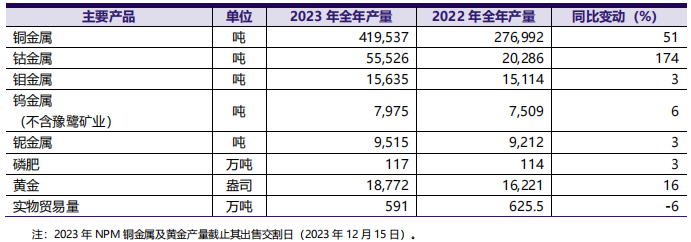 洛陽(yáng)鉬業(yè)年報(bào)披露,公司去年所有產(chǎn)品產(chǎn)量全部實(shí)現(xiàn)同比增長(zhǎng),銅、鈷、鈮、磷創(chuàng)歷史新高。具體來(lái)看,公司實(shí)現(xiàn)產(chǎn)銅產(chǎn)量41.95萬(wàn)噸,同比增長(zhǎng)51.46%,排名中國(guó)第二,接近全球前十;鈷產(chǎn)量5.55萬(wàn)噸,同比增長(zhǎng)174.31%,成為全球第一大鈷生產(chǎn)商。中國(guó)區(qū)鉬、鎢產(chǎn)量為15,635噸和7,975噸,全球保持領(lǐng)先地位。巴西鈮和磷肥產(chǎn)量為9,515噸和116.82萬(wàn)噸,創(chuàng)歷史新高。澳大利亞NPM銅、金產(chǎn)量分別為25,550噸和18,772盎司。