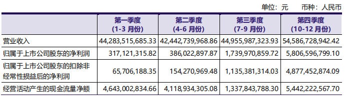 年報(bào)數(shù)據(jù)顯示,2023年,公司實(shí)現(xiàn)營(yíng)業(yè)收入1862.69億元,同比增長(zhǎng)7.68%;實(shí)現(xiàn)歸屬于母公司凈利潤(rùn)82.50億元,同比增長(zhǎng)36%,雙雙創(chuàng)下歷史新高。其中,第四季度實(shí)現(xiàn)盈利58.07億元,同比增長(zhǎng)257.89%,創(chuàng)下有史以來(lái)單季度盈利新高。
