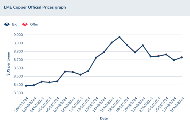 3月份以來全球銅價(jià)持續(xù)走高,3月16日,國際銅價(jià)(LME銅)一度上破至9000美元/噸關(guān)口;截至當(dāng)前,國際銅價(jià)依然超過8700美元/噸。