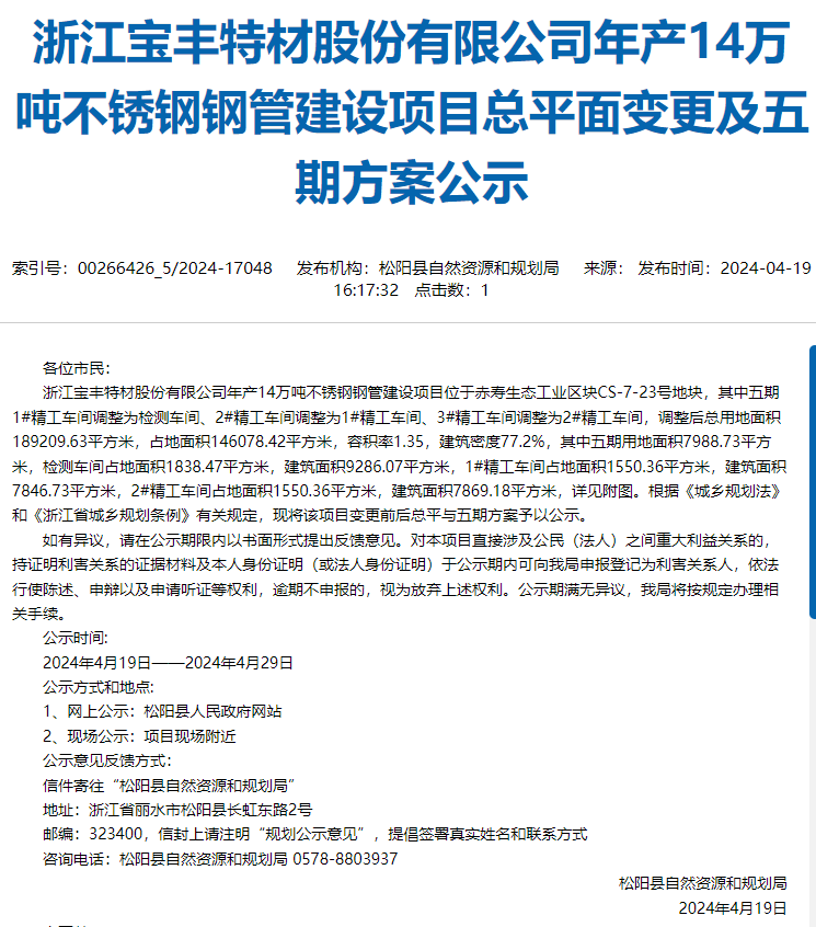 4月19日,麗水市松陽縣人民政府發(fā)布,松陽縣自然資源和規(guī)劃局就浙江寶豐特材股份有限公司年產(chǎn)14萬噸不銹鋼鋼管建設(shè)項(xiàng)目總平面變更及五期方案對外進(jìn)行公示,公示時(shí)間:2024年4月19日-2024年4月29日。