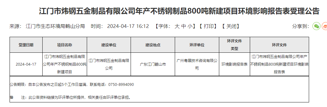 鶴山市人民政府消息,4月17日,江門市生態(tài)環(huán)境局鶴山分局受理江門市煒鋼五金制品有限公司年產(chǎn)不銹鋼制品800噸新建項(xiàng)目環(huán)境影響報(bào)告表并對外進(jìn)行公告,公告期:5個(gè)工作日。