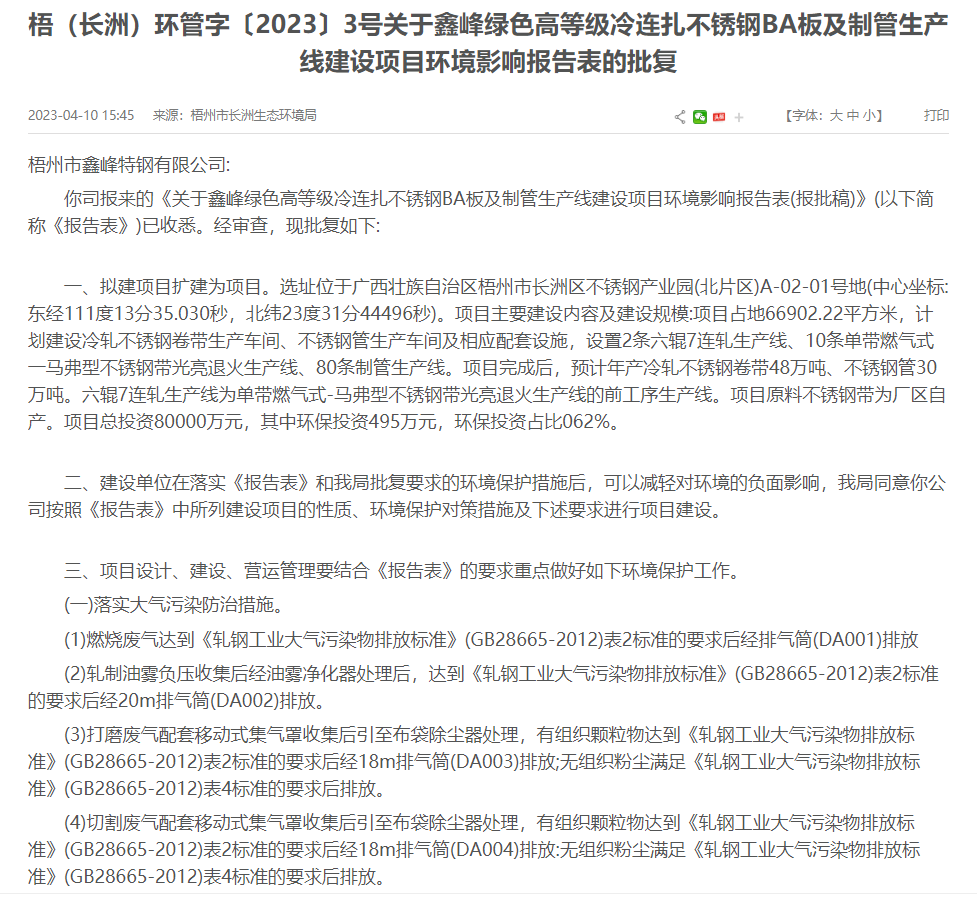 梧州市長洲生態(tài)環(huán)境局就鑫峰綠色高等級冷連扎不銹鋼BA板及制管生產(chǎn)線建設(shè)項(xiàng)目環(huán)境影響報(bào)告表作出批復(fù)意見。