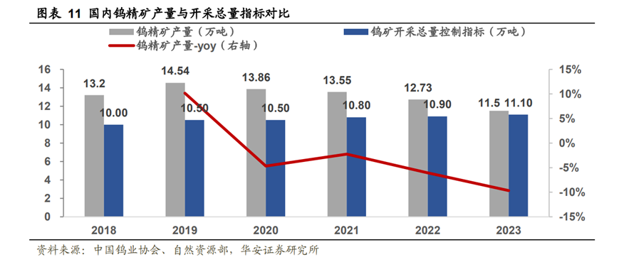 今年3月,自然資源部下達(dá)了2024年度首批僅為6.2萬噸的鎢礦開采總量控制指標(biāo),規(guī)模的收縮意味著國內(nèi)鎢精礦產(chǎn)量將延續(xù)下滑趨勢。隨著中國對鎢資源采取總量控制、出口配額管理、國家收儲(chǔ)等逐步收緊行業(yè)政策的實(shí)施,預(yù)計(jì)未來全球鎢礦供應(yīng)將逐步趨緊,鎢的產(chǎn)量增速將逐步放緩。