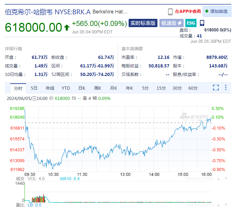 據(jù)悉,巴菲特從2019年首次投資西方石油,2022年一季度開(kāi)始連續(xù)三個(gè)季度大幅增持。今年2月初,巴菲特曾連續(xù)三個(gè)交易日增持西方石油,累計(jì)購(gòu)買(mǎi)430萬(wàn)股。截至當(dāng)?shù)貢r(shí)間6月5日收盤(pán),伯克希爾-哈撒韋美股報(bào)618000美元,漲幅0.09%,市值8879.40億美元。