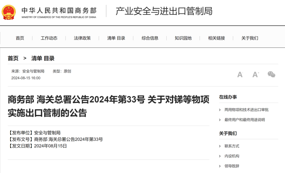 15日下午,商務(wù)部、海關(guān)總署聯(lián)合發(fā)布了《關(guān)于對銻等物項實施出口管制的公告》(下稱“公告”)。公告顯示,根據(jù)相關(guān)規(guī)定,為維護國家安全和利益、履行防擴散等國際義務(wù),經(jīng)國務(wù)院批準(zhǔn),決定對銻等物項實施出口管制。公告自2024年9月15日起正式實施。
