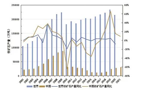 2001—2021年全球及中國(guó)鐵礦石產(chǎn)量對(duì)比