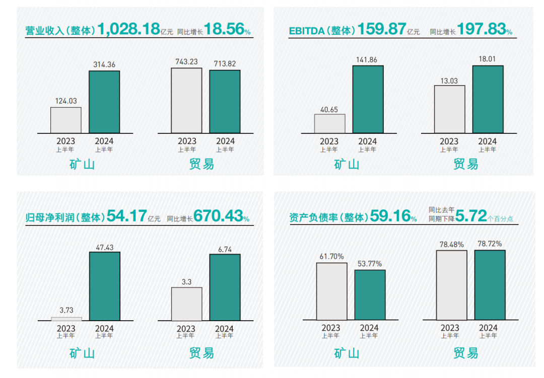 8月23日晚,洛陽鉬業(yè)發(fā)布的2024年中期報告顯示,上半年公司實現(xiàn)營業(yè)收入1028.18億元,同比增長18.56%,實現(xiàn)歸母凈利潤54.17億元,同比增長670.43%,均創(chuàng)下歷史新高;實現(xiàn)息稅折攤前利潤159.87億元,增長197.83%,資產負債率59.16%,同比下降5.72個百分點。同時,公司流動性充裕,上半年經營性凈現(xiàn)金流108億元,持有現(xiàn)金及現(xiàn)金等價物309億元。