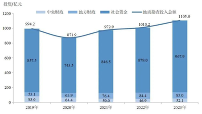 年報(bào)顯示,從2023年全國非油氣地質(zhì)勘查投入資金來源看,中央財(cái)政為46.23億元,占總量的23%,同比增長10.6%;地方財(cái)政為85.04億元,占總量的42.4%,同比增長0.7%;社會(huì)資金為69.45億元,占總量的34.6%,同比增長15.5%。從資金投向看,礦產(chǎn)勘查為117.56億元,占總量的58.5%;基礎(chǔ)地質(zhì)調(diào)查為22.23億元,占總量的11.1%;水文地質(zhì)、環(huán)境地質(zhì)與地質(zhì)災(zāi)害調(diào)查評(píng)價(jià)為38.33億元,占總量的19.1%;地質(zhì)科技與綜合研究為20.28億元,占總量的10.1%;地質(zhì)資料服務(wù)與信息化為2.32億元,占總量的1.2%。