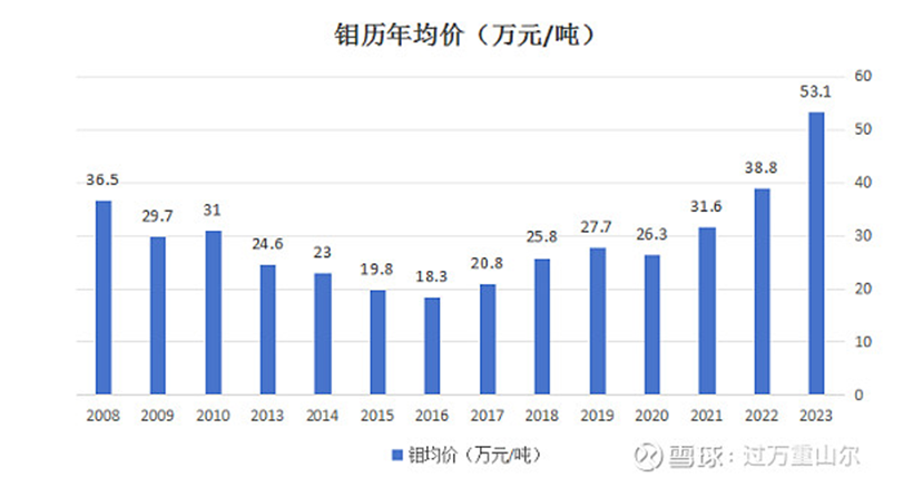 自2017年以來,在鉬供應端產(chǎn)量保持穩(wěn)定,而鉬需求穩(wěn)步提升的背景下,全球和國內(nèi)鉬行業(yè)供需格局都呈現(xiàn)緊平衡狀態(tài),鉬價格也進入上漲周期,2023年鉬均價達到了53.1萬噸。未來兩年,鉬的供給端增量不大,增量集中于2027年及以后,主要是沙坪溝項目投產(chǎn),新增2.72萬噸產(chǎn)能,以及大黑山鉬礦擴產(chǎn),新增0.64萬噸。