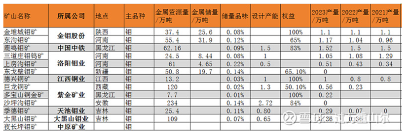 從企業(yè)來看,國內(nèi)鉬礦相關有金鉬股份、洛陽鉬業(yè)、中國中鐵(鹿鳴礦業(yè))、江西銅業(yè)(德興銅礦)、紫金礦業(yè)(巨龍銅礦、沙坪溝鉬礦、多寶山銅礦)等,上述5家企業(yè)2023年合計產(chǎn)量約7.16萬噸,約占國內(nèi)市場的65%。金鉬股份是國內(nèi)最大的鉬礦開采及鉬產(chǎn)品生產(chǎn)商,擁有陜西的金錐城鉬礦與河南的東溝鉬礦兩個核心礦山,產(chǎn)能都在一萬噸左右。
