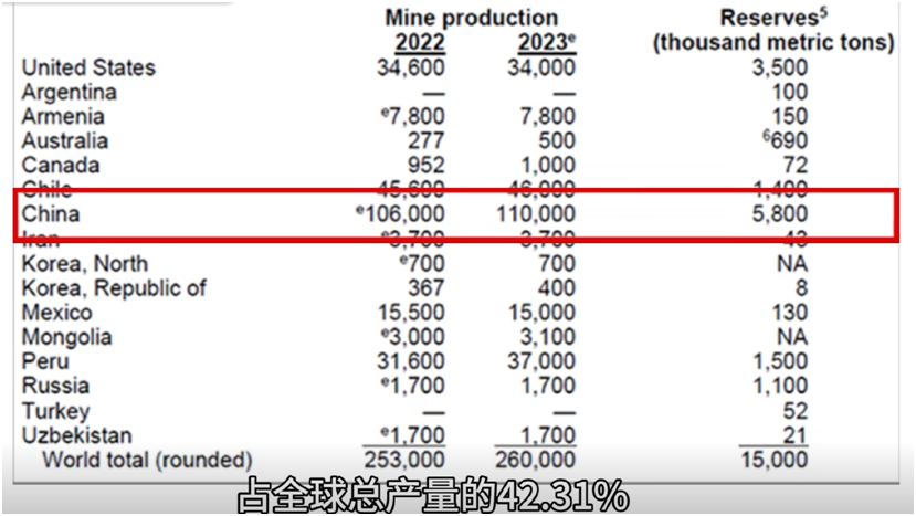 鉬,作為一種重要的不可再生的稀缺性戰(zhàn)略資源,以其獨特的性能廣泛應用于鋼鐵冶金、農(nóng)用化肥、電氣化工和航天等領域。根據(jù)USGS數(shù)據(jù)顯示,2023年,中國鉬礦資源儲量為580萬噸,占全球資源儲量的38.67%。其次為美國和秘魯,2023年鉬礦資源儲量分別為350萬噸和150萬噸,分別占比23.33%和10.00%。同時,中國也是全球最大的鉬生產(chǎn)國,據(jù)美國地質(zhì)調(diào)查局數(shù)據(jù)顯示,2023年,全球鉬產(chǎn)量約26萬噸,其中,中國約11萬噸,約占全球總產(chǎn)量的42.3%。