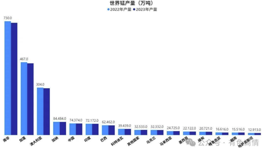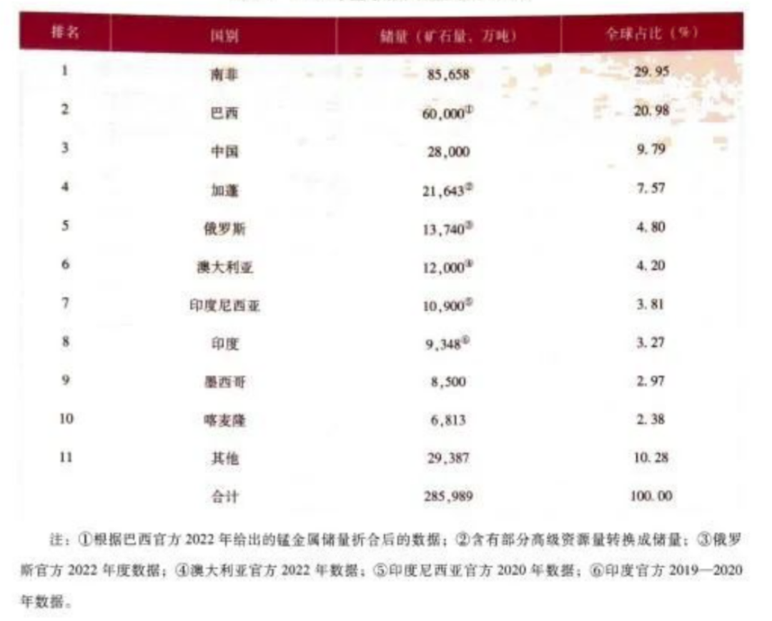 錳礦,是一種非常重要的戰(zhàn)略礦產資源,尤其是富錳礦和優(yōu)質錳礦資源,已經被中國列入到緊缺的礦種。錳及其化合物應用于國民經濟的各個領域,每輛特斯拉Model 3需要6.8公斤錳,而比亞迪刀片電池的磷酸錳鋰技術對高純度錳需求激增,錳已成為鋼鐵、新能源、新材料等產業(yè)的基本原料。從儲量分布來看,根據中國地調局發(fā)布的《全球礦產資源儲量評估報告2024》顯示,全球錳儲量28.6億噸(礦石量,下同),主要分布在南非(29.95%)、巴西(20.98%)、中國(9.79%)和加蓬(7.57%)等國,俄羅斯、澳大利亞、印度尼西亞、印度、墨西哥和喀麥隆等國家也有少量分布。