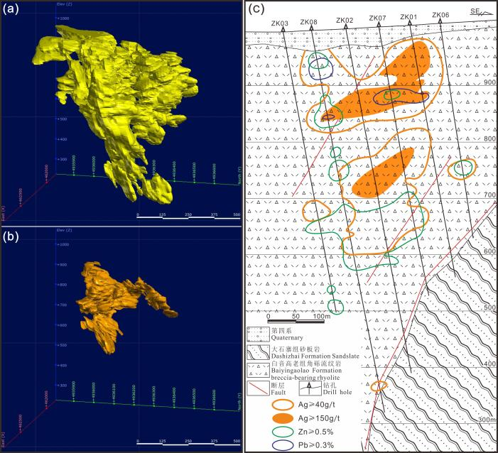 值得注意的是,布敦烏拉銀礦如按照銀工業(yè)品位的2-3倍作為富礦邊界指標(biāo)進(jìn)行富礦塊段的圈定(采用150 g/t),可獲得富銀礦石量1600萬噸,平均品位達(dá)350 g/t,可與墨西哥高品位銀礦相媲美,展現(xiàn)出極高的經(jīng)濟(jì)價(jià)值。