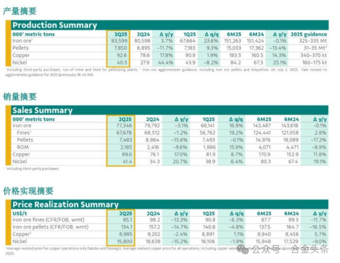 2025年第二季度,鐵礦石產(chǎn)量總計(jì)為8360萬(wàn)噸,同比增長(zhǎng)300萬(wàn)噸,增幅為4%。主要驅(qū)動(dòng)因素為布魯庫(kù)圖(Brucutu)運(yùn)營(yíng)區(qū)隨著第四條選礦生產(chǎn)線啟動(dòng)試運(yùn)行而取得強(qiáng)勁業(yè)績(jī),以及S11D礦區(qū)創(chuàng)下第二季度產(chǎn)量新紀(jì)錄。球團(tuán)產(chǎn)量總計(jì)為790萬(wàn)噸,同比減少100萬(wàn)噸,減幅為12%,符合修訂后的2025年產(chǎn)量指導(dǎo)目標(biāo)。鐵礦石銷(xiāo)量總計(jì)為7730萬(wàn)噸,同比減少240萬(wàn)噸,減幅為3%,系因公司實(shí)施了產(chǎn)品組合優(yōu)化戰(zhàn)略而優(yōu)先供應(yīng)中品位產(chǎn)品所致。
