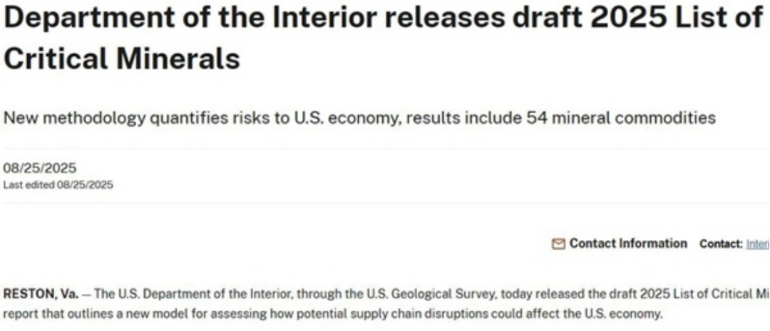 當(dāng)?shù)貢r(shí)間8月25日,美國地質(zhì)調(diào)查局發(fā)布《2025年關(guān)鍵礦產(chǎn)清單》草案,54種礦產(chǎn)被列入清單。根據(jù)美國《能源法案》,關(guān)鍵礦產(chǎn)是由美國地質(zhì)勘探局認(rèn)定的對(duì)美國經(jīng)濟(jì)和國家安全至關(guān)重要的礦產(chǎn)或物質(zhì),且相關(guān)礦產(chǎn)是產(chǎn)品制造的基礎(chǔ),但供應(yīng)鏈脆弱。被確定為關(guān)鍵礦產(chǎn)后,相關(guān)礦產(chǎn)的勘探開采和處理將享受資金激勵(lì)和更廣泛的支持性政策。