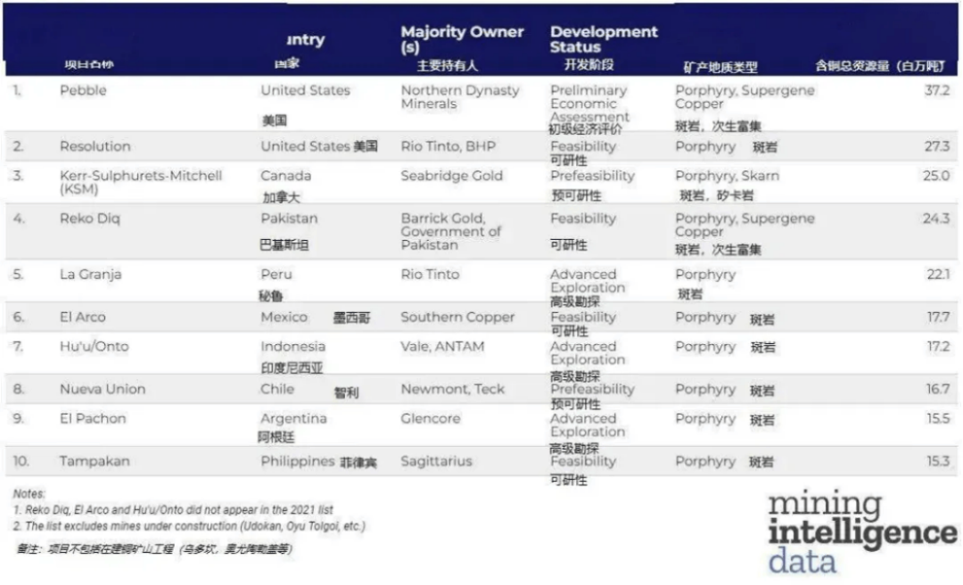 外媒Mining Intelligence根據(jù)三級(jí)(探明、推定和推測(cè))資源量更新了世界十大未開發(fā)銅礦項(xiàng)目。前兩的未開發(fā)銅礦均位于美國。
