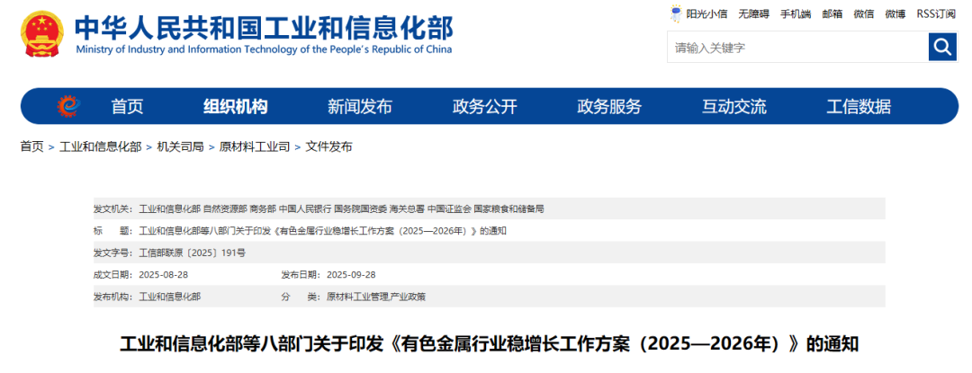 近日,工業(yè)和信息化部、自然資源部、商務(wù)部等八部門聯(lián)合印發(fā)《有色金屬行業(yè)穩(wěn)增長(zhǎng)工作方案(2025-2026年)》(以下簡(jiǎn)稱《工作方案》)。