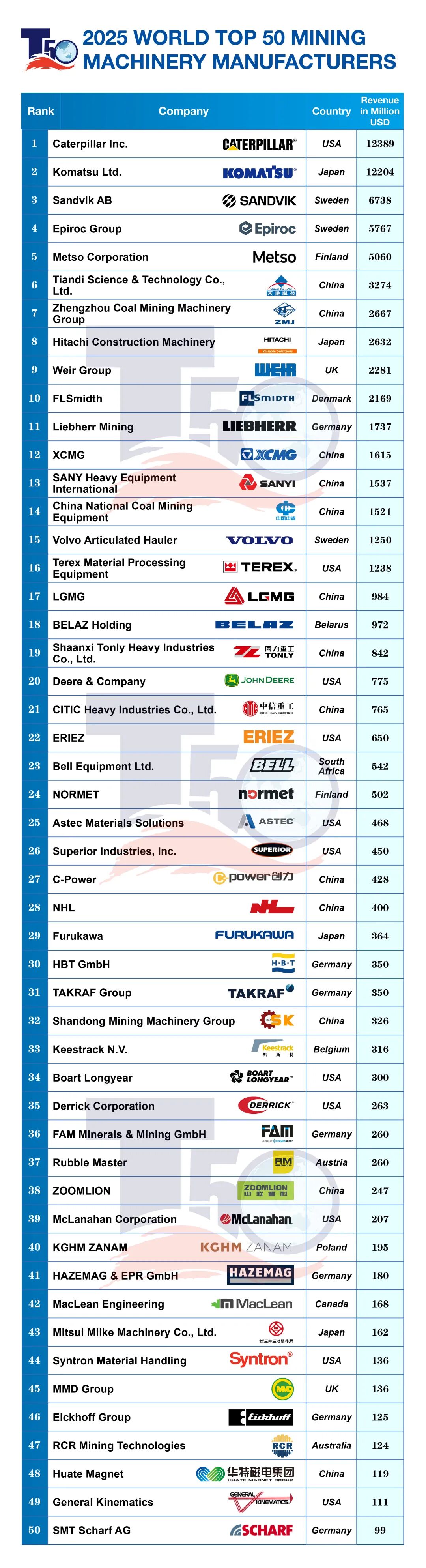 近日,“2025 全球礦山設(shè)備制造商 50 強(qiáng)” 榜單在印度尼西亞雅加達(dá)舉辦的 T50 峰會(huì)亞洲論壇上正式揭曉,揭示了全球礦業(yè)裝備制造業(yè)正在經(jīng)歷深刻變革。本屆榜單顯示,全球礦山設(shè)備制造行業(yè)總銷售額為 766.55 億美元,較上年下降 4.0%,行業(yè)競(jìng)爭(zhēng)格局出現(xiàn)新變化,其中中國(guó)企業(yè)表現(xiàn)尤為搶眼。