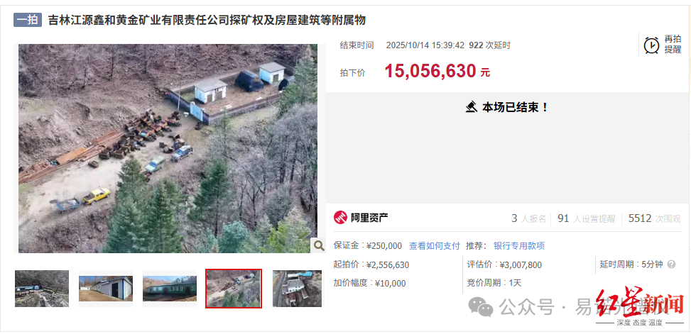 成交價(jià)1500萬(wàn)元:出價(jià)931輪,溢價(jià)率達(dá)489%!吉林一金礦探礦權(quán)等被拍賣